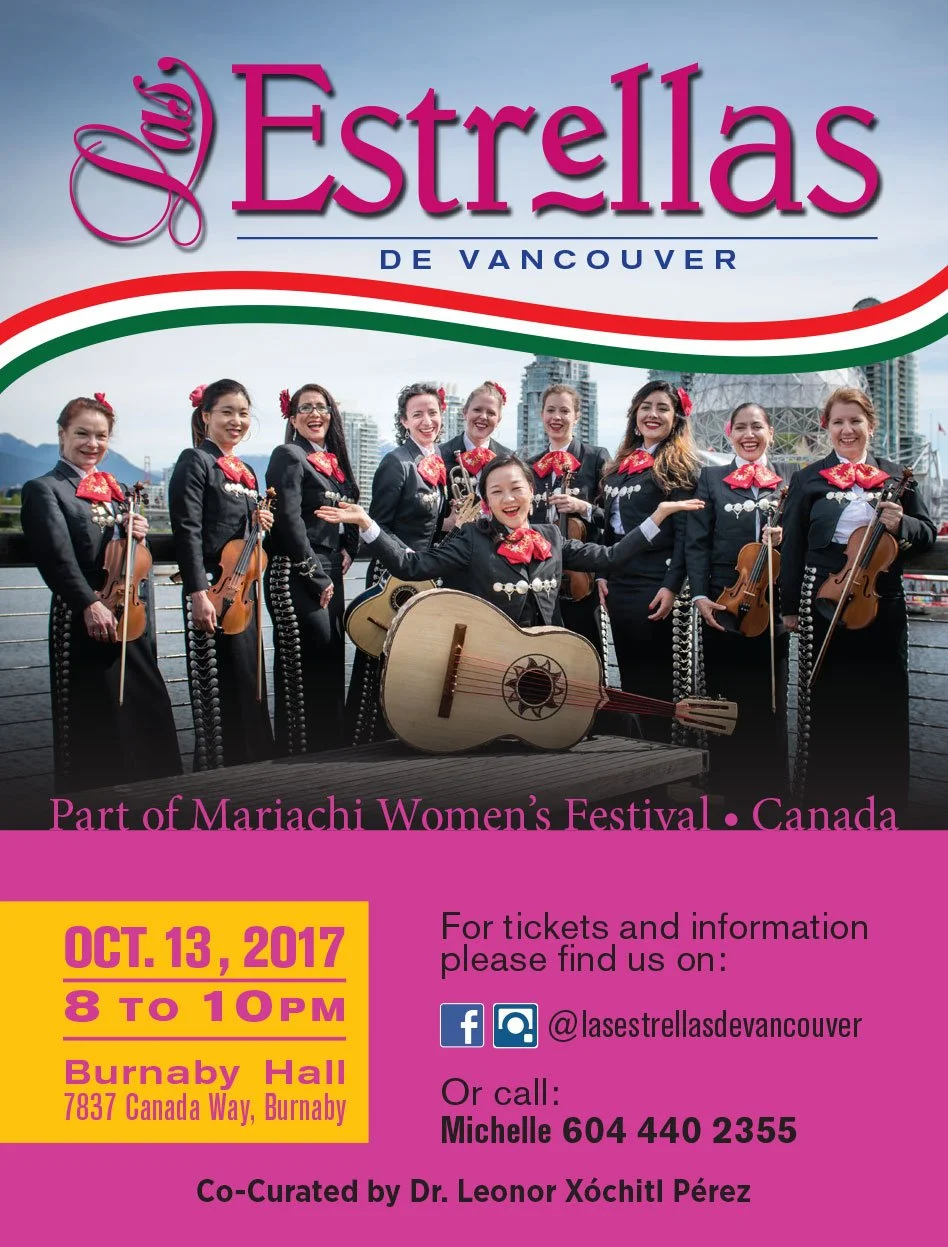 A thrilling musical collaboration was held between Las Estrellas de Vancouver and the Mariachi Women’s Festival in Los Angeles. Taking the lead from festival Director Dr. Leonor Xóchitl Pérez, Canadian Director Michelle Cormier launched mariachi women’s music concerts in Vancouver in 2015. This 2017 Canadian concert was yet another exciting celebration of women in mariachi music in a city where it was least expected.